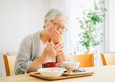 飲み込みにくい、むせるなどの症状がある方には、嚥下機能の評価やリハビリを実施しています。必要に応じて嚥下内視鏡検査を行い、表面麻酔を施したうえで鼻から直径約3ミリの鼻腔ファイバースコープを挿入し、食べ物を飲み込む様子を観察します。